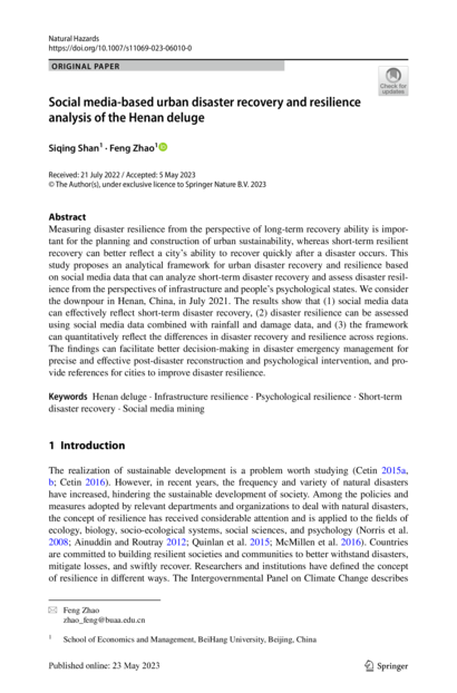 "Measuring disaster resilience from the perspective of long-term recovery ability is important for the planning and construction of urban sustainability, whereas short-term resilient recovery can better reflect a city’s ability to recover quickly after a disaster occurs. This study proposes an analytical framework for urban disaster recovery and resilience based on social media data that can analyze short-term disaster recovery and assess disaster resilience from the perspectives of infrastructure and people’s psychological states. We consider the downpour in Henan, China, in July 2021. The results show that (1) social media data can effectively reflect short-term disaster recovery, (2) disaster resilience can be assessed using social media data combined with rainfall and damage data, and (3) the framework can quantitatively reflect the differences in disaster recovery and resilience across regions. The findings can facilitate better decision-making in disaster emergency management for precise and effective post-disaster reconstruction and psychological intervention, and provide references for cities to improve disaster resilience." (Abstract)