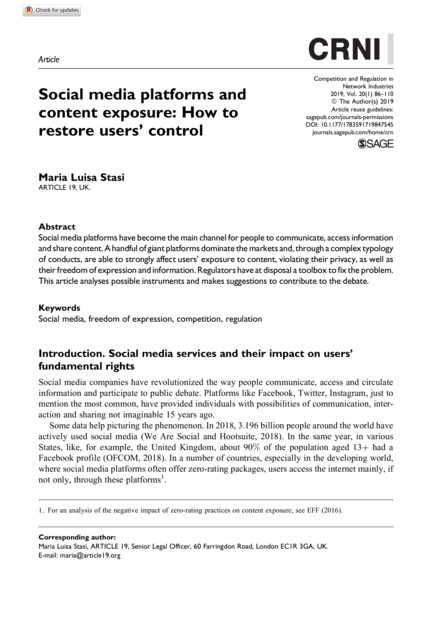 "Social media platforms have become themain channel for people to communicate, access information and share content. A handful of giant platforms dominate the markets and, through a complex typology of conducts, are able to strongly affect users’ exposure to content, violating their privacy, as well as their freedom of expression and information. Regulators have at disposal a toolbox to fix the problem. This article analyses possible instruments and makes suggestions to contribute to the debate." (Abstract)