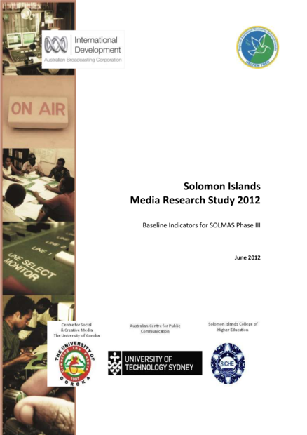 "This research study provides baseline indicators for the Solomon Islands Media Assistance Scheme (SOLMAS) Program Phase III. It presents findings around the current quality of media, experiences of training to date, and relationships with stakeholders such as development organisations, government communications and the National Disaster Management Office. This executive summary presents main findings from the study, under several key areas: media quality and inhibitors of quality; training and capacity building; audience needs and new media; media and development issues; the Media Association of Solomon Islands (MASI); the public broadcaster Solomon Islands Broadcasting Corporation (SIBC); and perceptions of SOLMAS to date." (Exexutive summary)