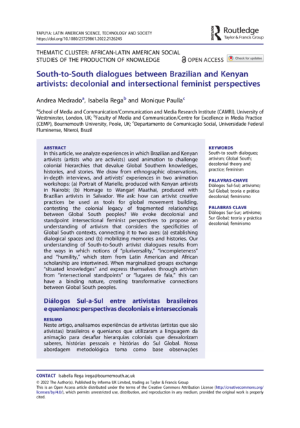 "In this article, we analyze experiences in which Brazilian and Kenyan artivists (artists who are activists) used animation to challenge colonial hierarchies that devalue Global Southern knowledges, histories, and stories. We draw from ethnographic observations, in-depth interviews, and artivistsf experiences in two animation workshops: (a) Portrait of Marielle, produced with Kenyan artivists in Nairobi; (b) Homage to Wangari Maathai, produced with Brazilian artivists in Salvador. We ask: how can artivist creative practices be used as tools for global movement building, contesting the colonial legacy of fragmented relationships between Global South peoples? We evoke decolonial and standpoint intersectional feminist perspectives to propose an understanding of artivism that considers the specificities of Global South contexts, connecting it to two axes: (a) establishing dialogical spaces and (b) mobilizing memories and histories. Our understanding of South-to-South artivist dialogues results from the ways in which notions of "pluriversality", "incompletness" and "humility", which stem from Latin American and African scholarship are intertwined. When marginalized groups exchange "situated knowledges" and express themselves through artivism from "intersectional standpoints" or "lugares de fala", this can have a binding nature, creating transformative connections between Global South peoples." (Abstract)