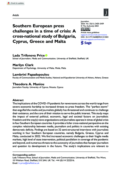 "The implications of the COVID-19 pandemic for newsrooms across the world range from severe economic hardship to increased threats to press freedom. The “perfect storm” that engulfed the media and journalists globally has threatened and continues to challenge their existence, and the core of their mission to serve the public interest. This study maps the impact of external political, economic, legal and societal factors on journalistic freedom and the way(s) news organizations and journalists operate in times of global crisis in four Southern European countries. It provides a fuller cross-national perspective on the complex relationship between media, journalism and politics in countries with existing democratic deficits. Findings are based on 32 semi-structured interviews with journalists working in four Southern European countries, namely Bulgaria, Greece, Cyprus and Malta, conducted in 2022. We find increased economic challenges to their fragile media markets, high level of state intervention, political parallelism in coverage of the pandemic and beyond, and numerous threats to the autonomy of journalists that hamper journalism and question its development in the future. The study’s implications are relevant to different contexts, particularly in countries where journalism and media face similar challenges." (Abstract)