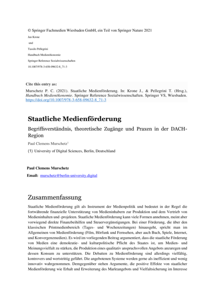 "Staatliche Medienförderung gilt als Instrument der Medienpolitik und bedeutet in der Regel die fortwährende finanzielle Unterstützung von Medieninhabern zur Produktion und dem Vertrieb von Medieninhalten und -projekten. Staatliche Medienförderung kann viele Formen annehmen, meint aber vorwiegend direkte Finanzbeihilfen und Steuervergünstigungen. Bei einer Förderung, die über den klassischen Printmedienbereich (Tages- und Wochenzeitungen) hinausgeht, spricht man im Allgemeinen von Medienförderung (Film, Hörfunk und Fernsehen, aber auch Buch, Spiele, Internet, und Konvergenzmedien). Es wird im vorliegenden Beitrag argumentiert, dass die staatliche Förderung von Medien eine demokratie- und kulturpolitische Pflicht des Staates ist, um Medien- und Meinungsvielfalt zu stärken, die Produktion eines qualitativ anspruchsvollen Angebots anzuregen und dessen Konsum zu unterstützen. Die Debatten zu Medienförderung sind allerdings vielfältig, kontrovers und wertstrittig geführt. Die angebotenen Systeme werden gerne als ineffizient und wenig innovativ wahrgenommen. Demgegenüber stehen Argumente, die positive Effekte von staatlicher Medienförderung wie Erhalt und Erweiterung des Marktangebots und Vielfaltsicherung im Interesse des Konsums hervorheben. Der vorliegende Beitrag gelangt auf Basis von Analysen ausgewählter Förderpraxen in der DACH-Region [Deutschland, Österreich, deutschsprachige Schweiz] zum Ergebnis, dass das Phänomen Medienförderung mit dem wissenschaftlichen Instrumentarium der Medienökonomie plausibel begründbar ist. Die aktuellen Förderpraxen sind in Richtung einer „integralen Medienförderung“ auszubauen." (Zusammenfassung)