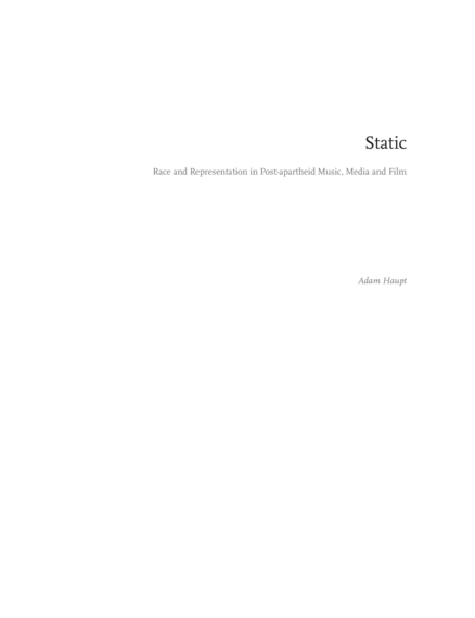 "Static: Race and Representation in Post-apartheid Music, Media and Film critically examines music, cinema, social media and the politics of change after apartheid. It cuts across academic disciplines, the creative arts and the media and poses two central questions: Is South Africa changing for the better, or are we static? Is there too much static for us to hear each other clearly? Static provides key insights into recent media phenomena, such as Die Antwoord; the 2010 Soccer World Cup; Bok van Blerk; Tsotsi; Kuli Roberts' Sunday World column on 'coloureds'; revisionist film Afrikaaps and the University of the Free State's Reitz video scandal." (Publisher description)