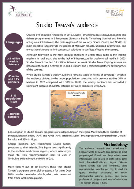 "Created by Fondation Hirondelle in 2013, Studio Tamani broadcasts news, magazine and debate programmes in 5 languages (Bambara, Peulh, Tamasheq, Sonrhai and French), acting as a link between the main regions of the country (South, Centre and North). Its main objective is to provide the people of Mali with reliable, unbiased information, and encourage dialogue to find consensual solutions to conflicts affecting the country. Although television is the most popular medium in urban areas, radio is the leading medium in rural areas, due to the lack of infrastructure for audio-visual media. In 2023, Studio Tamani counted 3.4 million listeners per week. Studio Tamani’s programmes are broadcast through a network of 85 radio stations and 3 television partners, covering 95% of the country." (Page 1)