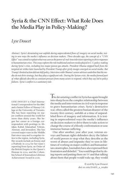 "Syria’s devastating war unfolds during unprecedented flows of imagery on social media, testing in new ways the media’s influence on decision-makers. Three decades ago, the concept of a “CNN Effect” was coined to explain what was seen as the power of real-time television reporting to drive responses to humanitarian crises. This essay explores the role traditional and new media played in U.S. policy-making during Syria’s crisis, including two major poison gas attacks. President Obama stepped back from the targeted air strikes later launched by President Trump after grisly images emerged on social media. But Trump’s limited action did not shift policy. Interviews with Obama’s senior advisors underline that the media do not drive strategy, but they play a significant role. During the Syrian crisis, the media formed part of what officials describe as constant pressure from many actors to respond, which they say led to policy failures. Syria’s conflict is a cautionary tale." (Abstract)
