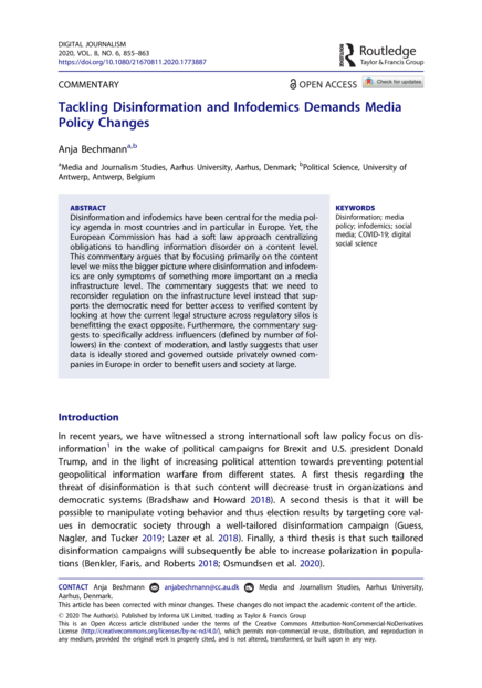 "Disinformation and infodemics have been central for the media policy agenda in most countries and in particular in Europe. Yet, the European Commission has had a soft law approach centralizing obligations to handling information disorder on a content level. This commentary argues that by focusing primarily on the content level we miss the bigger picture where disinformation and infodemics are only symptoms of something more important on a media infrastructure level. The commentary suggests that we need to reconsider regulation on the infrastructure level instead that supports the democratic need for better access to verified content by looking at how the current legal structure across regulatory silos is benefitting the exact opposite. Furthermore, the commentary suggests to specifically address influencers (defined by number of followers) in the context of moderation, and lastly suggests that user data is ideally stored and governed outside privately owned companies in Europe in order to benefit users and society at large." (Abstract)