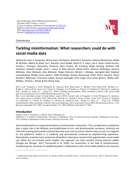 "We invited misinformation researchers to write a 250-word commentary about the research that they would hypothetically conduct if they had access to consenting participants’ social media data. The excerpts below provide concrete examples of studies that misinformation researchers could conduct, if the community had better access to platforms’ data and processes. Based on the contents of the submission, we have grouped these brief excerpts into five areas that could be improved, and conclude with an excerpt regarding the importance of data sharing: 1. measurement and design, 2. who engages with misinformation and why, 3. unique datasets with increased validity, 4. disinformation campaigns, 5. interventions, and 6. the importance of data sharing. While these excerpts are not comprehensive and may not be representative of the field as a whole, our hope is that this multi-authored piece will further the conversation regarding the establishment of more evenly distributed collaborations between researchers and platforms." (Introduction)