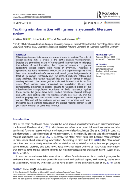 "Misinformation and fake news are severe threats to society. The role of critical reading skills is crucial in the battle against misinformation. Despite the promising results of game-based interventions to mitigate the effects of misinformation, the corpus of research on games supporting critical reading skills needs an overview. Therefore, a systematic literature review was conducted to analyze how games have been used to tackle misinformation and reveal game design trends. A total of 15 papers eventually met the defined inclusion criteria and were analyzed. The review revealed that the use of games in critical reading education had emerged recently and focused mainly on fake news. Most games were grounded on inoculation theory and consequently designed to expose players to weakened doses of the misinformation manipulation techniques to build resistance against them. So far, the games have been studied mainly in informal settings and with adult participants. The median sample size was 196, and the median playing time was 15 min across the studies reported in the papers. Although all the reviewed papers reported positive outcomes, the game-based learning research on the critical reading domain is not yet mature enough to generalize findings." (Abstract)