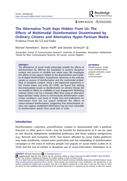 "The affordances of social media potentially amplify the effects of disinformation by offering the possibility to present deceptive content and sources in credible and native ways. We investigate the effects of two aspects related to the dissemination and modality of digital disinformation: (In)authentic references to the ordinary people as sources of disinformation and the multimodal embedding of deceptive content. Using a pre-registered experiment in the United States and India (N = 1008), we found that adding decontextualized visuals to disinformation on climate change did not amplify its effects on credibility or user engagement. Mimicking ordinary citizen cues has a stronger effect than using an alternative hyper-partisan media source to communicate disinformation under certain conditions. Low levels of media trust and preferences for information from the vox populi moderate the effects of citizen-initiated disinformation, suggesting that disenchanted citizens who oppose established information may be most vulnerable to disinformation attacks from social bots or trolls." (Abstract)