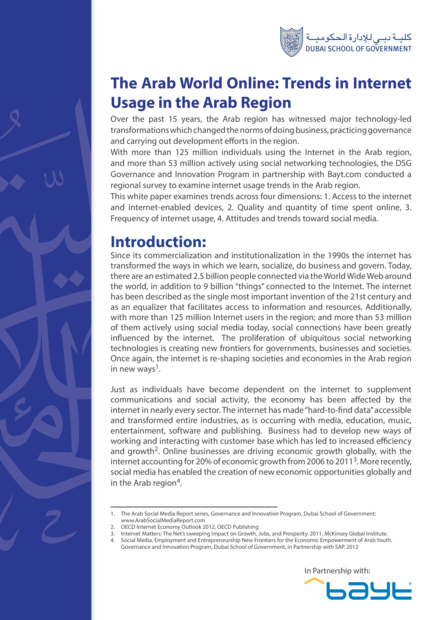 "With more than 125 million individuals using the Internet in the Arab region, and more than 53 million actively using social networking technologies, the DSG Governance and Innovation Program in partnership with Bayt.com conducted a regional survey to examine internet usage trends in the Arab region. This white paper examines trends across four dimensions: 1. Access to the internet and internet-enabled devices, 2. Quality and quantity of time spent online, 3. Frequency of internet usage, 4. Attitudes and trends toward social media." (Page 1)