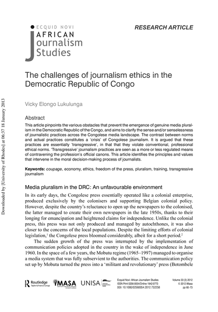 "This article pinpoints the various obstacles that prevent the emergence of genuine media pluralism in the Democratic Republic of the Congo, and aims to clarify the sense and/or senselessness of journalistic practices across the Congolese media landscape. The contrast between norms and actual practices constitutes a ‘crisis’ of Congolese journalism. It is argued that these practices are essentially ‘transgressive’, in that that they violate conventional, professional ethical norms. ‘Transgressive’ journalism practices are seen as a more or less regulated means of contravening the profession's official canons. This article identifies the principles and values that intervene in the moral decision-making process of journalists." (Abstract)