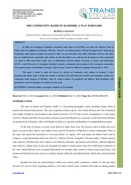 "In India, the campaign to legitimise community radio began in mid-1990s, soon after the Supreme Court of India ruled in its judgment of February 1995 that “airwaves are public property. Though the approval for setting up of Community radio stations in India was granted in 2002, it is yet to develop in the valley of Kashmir. Till now, the valley has not established any community radio station, but the first effort to use radio for the development of the community was made in 2009 when Panos South Asia, in collaboration with the Islamic University of Science and Technology (IUST), a rural University in Awantipora (Kashmir) started a community radio program in the Awantipora community. The program named “Pesh Kadam” meaning “Step Forward” started in 2009 and completed 350 episodes in 2018. This paper is aimed to study the reasons for absence of community radio stations in Kashmir. It also documents the efforts made to bring this medium to Kashmir and understand the evolution and challenges of first ever community radio program in Kashmir, study its content, analyse its popularity and efficacy. Both qualitative and quantitative research techniques are deployed in this study." (Abstract)