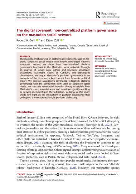 "The majority of scholarship on platform governance focuses on for-profit, corporate social media with highly centralized network structures. Instead, we show how non-centralized platform governance functions in the Mastodon social network. Through an analysis of survey data, Github and Discourse developer discussions, Mastodon Codes of Conduct, and participant observations, we argue Mastodon’s platform governance is an exemplar of the covenant, a key concept from federalist political theory. We contrast Mastodon’s covenantal federalism platform governance with the contractual form used by corporate social media. We also use covenantal federalist theory to explain how Mastodon’s users, administrators, and developers justify revoking or denying membership in the federation. In doing so, this study sheds new light on the innovations in platform governance that go beyond the corporate/alt-right platform dichotomy." (Abstract)