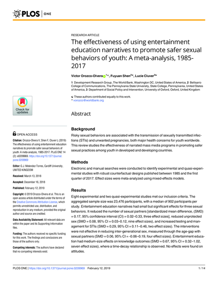"Risky sexual behaviors are associated with the transmission of sexually transmitted infections (STIs) and unwanted pregnancies, both major health concerns for youth worldwide. This review studies the effectiveness of narrated mass media programs in promoting safer sexual practices among youth in developed and developing countries." (Abstract)