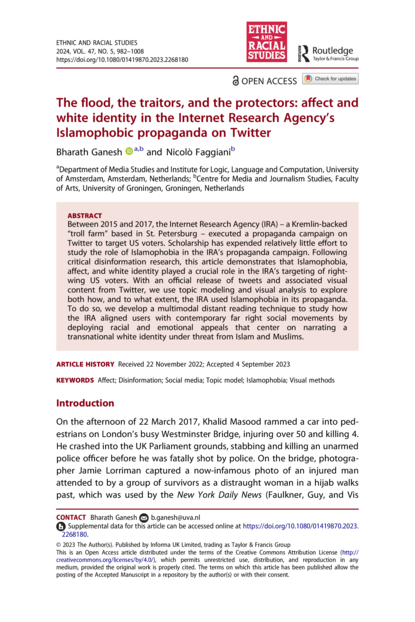 "Between 2015 and 2017, the Internet Research Agency (IRA) – a Kremlin-backed “troll farm” based in St. Petersburg – executed a propaganda campaign on Twitter to target US voters. Scholarship has expended relatively little effort to study the role of Islamophobia in the IRA’s propaganda campaign. Following critical disinformation research, this article demonstrates that Islamophobia, affect, and white identity played a crucial role in the IRA’s targeting of rightwing US voters. With an official release of tweets and associated visual content from Twitter, we use topic modeling and visual analysis to explore both how, and to what extent, the IRA used Islamophobia in its propaganda. To do so, we develop a multimodal distant reading technique to study how the IRA aligned users with contemporary far right social movements by deploying racial and emotional appeals that center on narrating a transnational white identity under threat from Islam and Muslims." (Abstract)