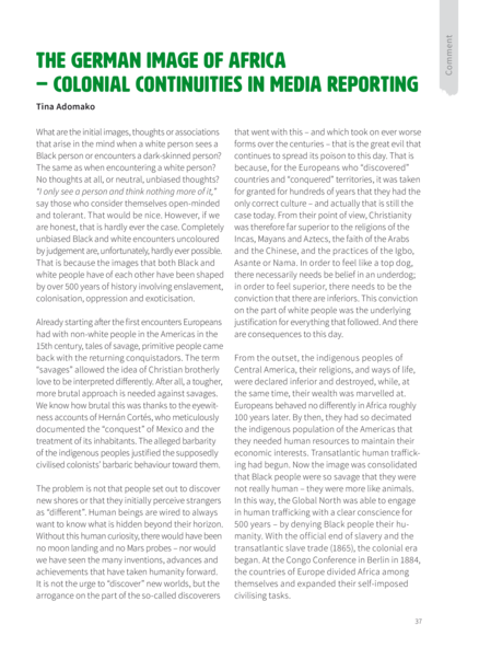 "Misery and poverty do exist, and the media should not be ignoring that. However, the status of the African continent cannot be judged without addressing the 500 years of slave trade. Our prosperity has been built by the unpaid labour of Black people and with the resources stolen from their countries of origin. We have become accustomed to seeing the Global South as a place of misery, which, thanks to bad governance, corrupt governments and uneducated people, is to blame for its own misery. We hold on to our images because it is more comfortable for us that way. Otherwise, we would have to rewrite our entire history. In her famous TED talk, author Chimananda Ngozi Adichie criticises the “danger of a single story” – the danger of continuing to tell a one-sided narrative about Africa and its people. It is time to leave the comfort zone, to finally teach the contexts truthfully and to recognise and question the colonial continuities, thereby allowing not only a new, but a more honest, image of Africa and Black people to emerge." (Conclusion, page 43-44)