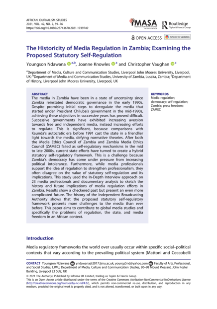 "The media in Zambia have been in a state of uncertainty since Zambia reinstated democratic governance in the early 1990s. Despite promising initial steps to deregulate the media that started under President Chiluba’s government in the mid-1990s, achieving these objectives in successive years has proved difficult. Successive governments have exhibited increasing aversion towards free and independent media, instead increasing efforts to regulate. This is significant, because comparisons with Kaunda’s autocratic era before 1991 cast the state in a friendlier light towards the media, defying normative theories. After both the Media Ethics Council of Zambia and Zambia Media Ethics Council (ZAMEC) failed as self-regulatory mechanisms in the mid to late 2000s, current state efforts have turned to create a hybrid statutory self-regulatory framework. This is a challenge because Zambia’s democracy has come under pressure from increasing political intolerance. Furthermore, while media professionals support the idea of regulation to strengthen professionalism, they often disagree on the value of statutory self-regulation and its implications. This study used the In-Depth Interview approach on 23 media professionals and documentary analysis to sketch the history and future implications of media regulation efforts in Zambia. Results show a checkered past but present an even more complicated future. The history of the Independent Broadcasting Authority shows that the proposed statutory self-regulatory framework presents more challenges to the media than ever before. This paper aims to contribute to global media studies and specifically the problems of regulation, the state, and media freedom in an African context." (Abstract)