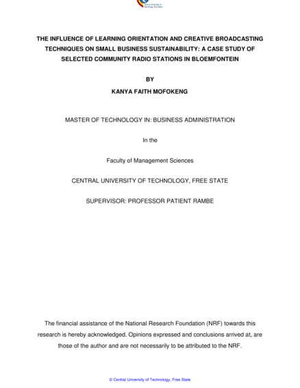 "The current study, which recognises the importance of creating learning organisations and the introduction of new broadcasting techniques to the survival of an organisation, explores the influence of learning orientation (LO) and creative broadcasting techniques (CBT) on the sustainability of CRS. There exists extant literature that attests to LO as an antecedent of innovation and the sustainability of firms on the one hand, and new broadcasting capabilities and procedures (CBT) as instrumental to the long-term sustainability of CRS on the other. Yet studies that explore the intersection of these three variables (i.e. LO, CBT and the diverse forms of sustainability) are hard to come by, hence this study. The study draws on an interpretive epistemology, qualitative approach and two case studies of CRS located in Bloemfontein, Free State. It investigates the LO and CBT of these institutions to develop some in-depth knowledge of their influence on the community stations’ sustainability. The researcher conducted in-depth interviews with CRS managers, producers and presenters and observed the broadcasting practices and activities of these CRS. The results of the study reveal that LO and CBT, especially the implementation of each of the components, positively influenced organisational, financial and social sustainability of CRS. The study recommends that each CRS should draw up a station constitution, which specifies the code of good practice and conduct in conformity to their licencing conditions, vision and goals. The constitution should be availed to all employees to ensure unity of purpose and common understanding of the practices adopted and methods implemented by the CRS." (Abstract)