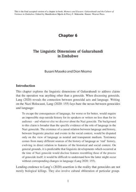 "This chapter explored the linguistic dimensions of Gukurahundi to show the centrality of language before, during and after the genocide. We drew on online testimonies from survivors and statements from government officials as well as visible language planning and language practices in the post-Gukurahundi era. In doing so, we have shown how the Shona language was weaponised and continues to be deployed as a tool for perpetuating the legacy of Gukurahundi in symbolic forms. Languages are more than neutral instruments of communication; they reflect important symbolic and identity roles, particularly in post-conflict societies. In post Gukurahundi Zimbabwe, the issue of language has remained topical as language is an important means of maintaining, legitimating, effectuating and reproducing unequal relations of power. The foregoing suggests that the presentation of the Shona language within the Zimbabwean state, state-aligned institutions and in Zimbabwean society at large reflects the cultural and political antagonisms dating back to the preindependence era. It is in fact a subtle form violence that undermines everything that is different. As a continuation of conflict in symbolic and cultural ways in supposed times of peace, this has implications for processes of reconciliation. Consequently, for victims and survivors, the term gukurahundi has become a synonym and a metaphor for the structural violence and subjugation experienced contemporaneously." (Conclusion)