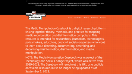 "The Media Manipulation Casebook is a research platform [launched in 2019] that advances knowledge of misinformation and disinformation and their threats to democracy, public health, and security. The Casebook is a resource for building the field of Critical Internet Studies by equipping researchers with case studies, theory, methods, and frameworks to analyze the interplay of media ecosystems, technology, politics, and society. Though the Technology and Social Change project (TaSC) project has ended as of September 2023, the Casebook site will remain live as a research resource." (About us)