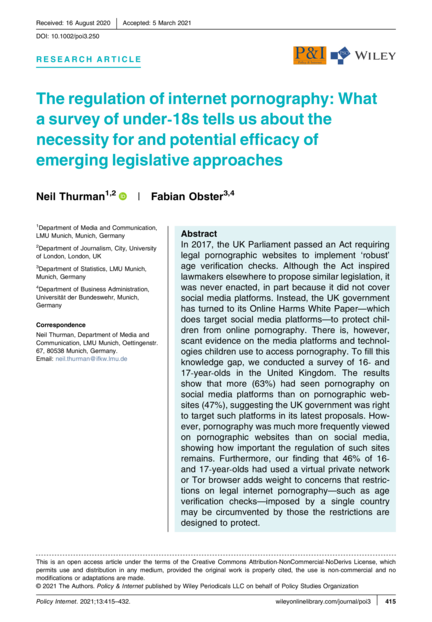 "In 2017, the UK Parliament passed an Act requiring legal pornographic websites to implement 'robust' age verification checks. Although the Act inspired lawmakers elsewhere to propose similar legislation, it was never enacted, in part because it did not cover social media platforms. Instead, the UK government has turned to its Online Harms White Paper - which does target social media platforms - to protect children from online pornography. There is, however, scant evidence on the media platforms and technologies children use to access pornography. To fill this knowledge gap, we conducted a survey of 16- and 17-year-olds in the United Kingdom. The results show that more (63%) had seen pornography on social media platforms than on pornographic websites (47%), suggesting the UK government was right to target such platforms in its latest proposals. However, pornography was much more frequently viewed on pornographic websites than on social media, showing how important the regulation of such sites remains. Furthermore, our finding that 46% of 16- and 17-year-olds had used a virtual private network or Tor browser adds weight to concerns that restrictions on legal internet pornography - such as age verification checks - imposed by a single country may be circumvented by those the restrictions are designed to protect." (Abstract)