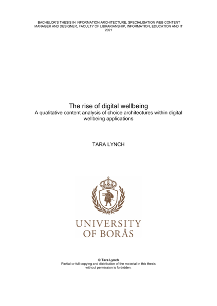 "This study examines choice architectures within contemporary digital wellbeing applications to better understand their design and structure. Specifically, it investigates how design influences decision-making processes and self-regulatory systems. Empirical data was gathered from six digital wellbeing applications and analysed abductively by adopting a qualitative content analysis approach. Despite all the applications having a high user rating, they are not designed to facilitate self-regulation. Instead of providing helpful tools to mitigate problematic smartphone use, the applications use strategies that emphasise overriding set time limits. Furthermore, digital wellbeing design principles can be considered ambiguous and lack sufficient understanding of information architecture and psychology. The results led to discussions about the motives behind digital wellbeing, contextual awareness, and how digital wellbeing challenges current views of ethics and design strategies." (Abstract)