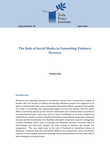 "Myanmar was originally portrayed as an internet success story. Connected in a matter of months after five decades of military dictatorship, Myanmar people were supposed to be able to communicate freely, access unimpeded information online, experience the benefits of a range of compelling and empowering digital services, and connect with the world. While social media opened up the country’s information and communication ecosystem in an unprecedented way, it also came with its share of challenges. Low levels of digital and media literacy, amidst a context of political transition, dominated by rising inter-communal tensions and the formalisation of a Buddhist nationalist movement, made for a dangerous cocktail. Facebook, which came to dominate the Myanmar internet ecosystem, failed to acknowledge and effectively mitigate the risks, letting its platform get abused and weaponised. This case study looks at the role of Facebook in fomenting violence in Myanmar. It explores how the social media platform was weaponised, reviews Facebook’s response to the situation, and draws learnings and recommendations for how risks may be better mitigated, moving forward." (Introduction)