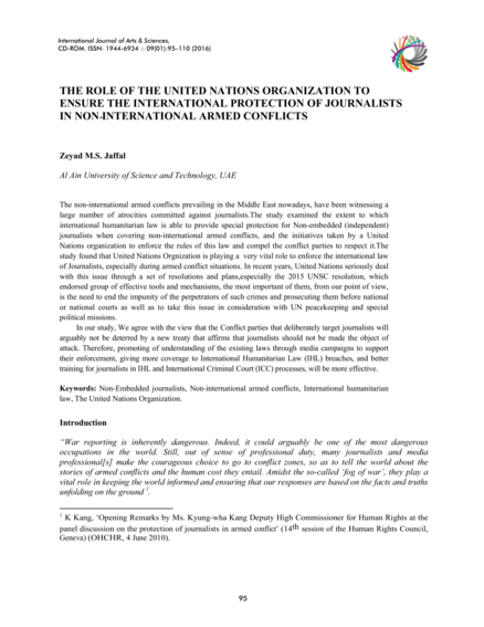 "The non-international armed conflicts prevailing in the Middle East nowadays, have been witnessing a large number of atrocities committed against journalists. The study examined the extent to which international humanitarian law is able to provide special protection for Non-embedded (independent) journalists when covering non-international armed conflicts, and the initiatives taken by a United Nations organization to enforce the rules of this law and compel the conflict parties to respect it. The study found that United Nations Orgnization is playing a very vital role to enforce the international law of Journalists, especially during armed conflict situations. In recent years, United Nations seriously deal with this issue through a set of resolutions and plans, especially the 2015 UNSC resolution, which endorsed group of effective tools and mechanisms, the most important of them, from our point of view, is the need to end the impunity of the perpetrators of such crimes and prosecuting them before national or national courts as well as to take this issue in consideration with UN peacekeeping and special political missions. In our study, we agree with the view that the Conflict parties that deliberately target journalists will arguably not be deterred by a new treaty that affirms that journalists should not be made the object of attack. Therefore, promoting of understanding of the existing laws through media campaigns to support their enforcement, giving more coverage to International Humanitarian Law (IHL) breaches, and better training for journalists in IHL and International Criminal Court (ICC) processes, will be more effective." (Abstract)