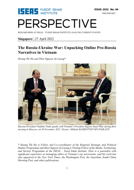 "The Russia-Ukraine war’s ramifications for Vietnam are felt beyond the economic and diplomatic realms. It has in fact become an online hotbed of conflicting and confounding narratives that demonstrate different worldviews and political leanings among Vietnamese netizens. An examination of 28 Facebook pages/groups active in trending pro-Russia narratives finds an ‘echo chamber’ that is on a constant lookout for Russian, Western and even Chinese news sources that peddle and amplify pro-Russia and anti-Western voices. The most salient pro-Russia narratives in Vietnam’s cyberspace revolve around justifying Russia’s invasion of Ukraine, echoing anti-America and anti-imperialist worldviews, and lionising Russia while demonising Ukraine. These online groups have likely carved out a niche for the conservative segment of the Vietnamese state to shape a propaganda environment where there is space for pro-Russia and anti-Russia narratives, so that pro-Ukraine sentiments will not become predominant in the public discourse. Pro-Russia narratives in Vietnam’s cyberspace are the result of cross-pollination between sentimental attachment since the Soviet era, psychological bias towards Russia embedded in Vietnam’s education and propaganda system, and the overriding imperative to preserve the Vietnamese state’s political and ideological interests." (Executive summary)