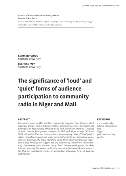 "Community radio in Mali and Niger represents important hubs through which organized groups (such as listening clubs or associations) access information and participate in broadcasting through active and formalized channels. Drawing on radio listener focus groups conducted in Mali and Niger between 2018 and 2020, this article discusses the importance, to community radio, of ‘loud’ participation (formalized spaces) and ‘quiet’ participation (informal discussion spaces) amongst audiences. We argue that these ‘quiet’ forms of participation are important as they reinforce and support existing networks of solidarity in the community. Community radio stations rarely ‘hear’ listener participation via these informal spaces of discussion – which are more closely associated with women – but they are nonetheless crucial, yet overlooked, alternative forms of audience participation." (Abstract)
