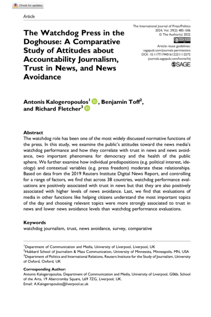 "The watchdog role has been one of the most widely discussed normative functions of the press. In this study, we examine the public’s attitudes toward the news media’s watchdog performance and how they correlate with trust in news and news avoidance, two important phenomena for democracy and the health of the public sphere. We further examine how individual predispositions (e.g. political interest, ideology) and contextual variables (e.g. press freedom) moderate these relationships. Based on data from the 2019 Reuters Institute Digital News Report, and controlling for a range of factors, we find that across 38 countries, watchdog performance evaluations are positively associated with trust in news but that they are also positively associated with higher levels of news avoidance. Last, we find that evaluations of media in other functions like helping citizens understand the most important topics of the day and choosing relevant topics were more strongly associated to trust in news and lower news avoidance levels than watchdog performance evaluations." (Abstract)