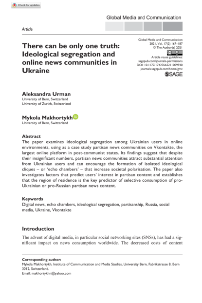 "The paper examines ideological segregation among Ukrainian users in online environments, using as a case study partisan news communities on Vkontakte, the largest online platform in post-communist states. Its findings suggest that despite their insignificant numbers, partisan news communities attract substantial attention from Ukrainian users and can encourage the formation of isolated ideological cliques – or ‘echo chambers’ – that increase societal polarisation. The paper also investigates factors that predict users’ interest in partisan content and establishes that the region of residence is the key predictor of selective consumption of pro-Ukrainian or pro-Russian partisan news content." (Abstract)