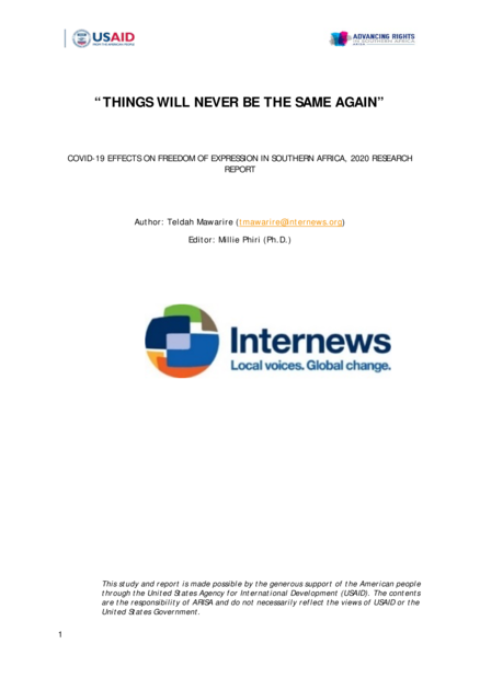 "Sadly the research reveal that COVID-19 temporary measures and laws on lockdowns dented freedom of expression gains that had been made over the years with concerns that if there is no financial intervention or adoption of sustainable revenue solutions in SADC, print media that were already in financial dire straits before the pandemic, will close their doors permanently. The pandemic saw countries invoking shutdowns that restricted movement and, in some cases, resulted in companies closing causing loss of jobs and income and impacting on media revenues from newspapers sales and advertising. Findings also show that the pandemic had various effects on journalism quality, mental integrity of journalists and operational problems that rendered the work of journalists difficult [...] The findings reveal that the COVID-19 restrictions denied journalists and citizens the rights to express themselves freely, thereby interfering with the rights of citizens to access critical information that could have helped them to make informed decisions as well as fight stigma and discrimination during the lockdowns." (Executive summary)