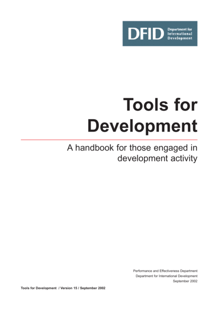 "Tools for Development" aims to help you deliver successful development activities and interventions by giving you access to the skills and techniques you will need to do so. The demand for it has come from DFID staff both in the UK and overseas who recognise that development initiatives inside and outside DFID need to be designed and managed using people-driven and performancebased management methods. Over the past decade, DFID has worked with others to develop new methodologies and refine earlier ones to support such approaches; the range of techniques from which to choose is still expanding." (Introduction, page 1.1)