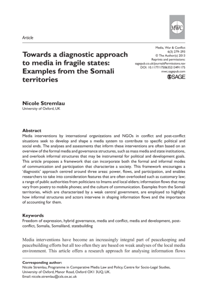 "Media interventions by international organizations and NGOs in conflict and post-conflict situations seek to develop and shape a media system to contribute to specific political and social ends. The analyses and assessments that inform these interventions are often based on an overview of the formal media and governance structures, such as mass media and state institutions, and overlook informal structures that may be instrumental for political and development goals. This article proposes a framework that can incorporate both the formal and informal modes of communication and participation that characterize a society. This framework encourages a ‘diagnostic’ approach centred around three areas: power, flows, and participation, and enables researchers to take into consideration features that are often overlooked such as customary law; a range of public authorities from politicians to Imams and local elders; information flows that may vary from poetry to mobile phones; and the culture of communication. Examples from the Somali territories, which are characterized by a weak central government, are employed to highlight how informal structures and actors intervene in shaping information flows and the importance of accounting for them." (Abstract)
