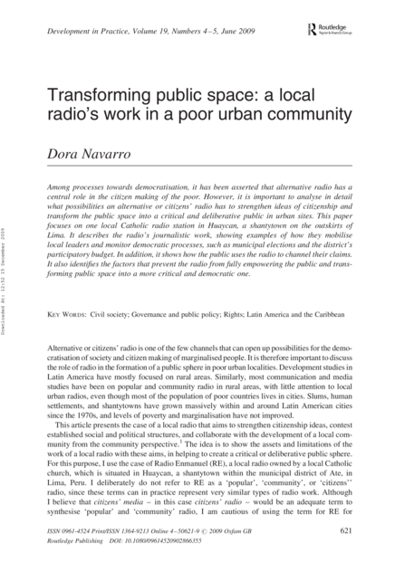 "Among processes towards democratisation, it has been asserted that alternative radio has a central role in the citizen making of the poor. However, it is important to analyse in detail what possibilities an alternative or citizens' radio has to strengthen ideas of citizenship and transform the public space into a critical and deliberative public in urban sites. This paper focuses on one local Catholic radio station in Huaycan, a shantytown on the outskirts of Lima. It describes the radio's journalistic work, showing examples of how they mobilise local leaders and monitor democratic processes, such as municipal elections and the district's participatory budget. In addition, it shows how the public uses the radio to channel their claims. It also identifies the factors that prevent the radio from fully empowering the public and transforming public space into a more critical and democratic one." (Abstract)
