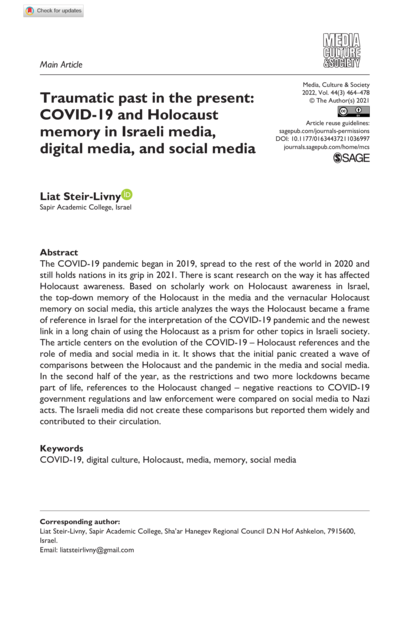 "The COVID-19 pandemic began in 2019, spread to the rest of the world in 2020 and still holds nations in its grip in 2021. There is scant research on the way it has affected Holocaust awareness. Based on scholarly work on Holocaust awareness in Israel, the top-down memory of the Holocaust in the media and the vernacular Holocaust memory on social media, this article analyzes the ways the Holocaust became a frame of reference in Israel for the interpretation of the COVID-19 pandemic and the newest link in a long chain of using the Holocaust as a prism for other topics in Israeli society. The article centers on the evolution of the COVID-19 – Holocaust references and the role of media and social media in it. It shows that the initial panic created a wave of comparisons between the Holocaust and the pandemic in the media and social media. In the second half of the year, as the restrictions and two more lockdowns became part of life, references to the Holocaust changed – negative reactions to COVID-19 government regulations and law enforcement were compared on social media to Nazi acts. The Israeli media did not create these comparisons but reported them widely and contributed to their circulation." (Abstract)