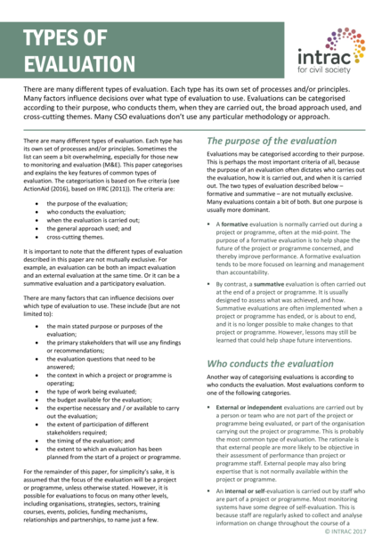 "There are many different types of evaluation. Each type has its own set of processes and/or principles. Many factors influence decisions over what type of evaluation to use. Evaluations can be categorised according to their purpose, who conducts them, when they are carried out, the broad approach used, and cross-cutting themes. Many CSO evaluations don’t use any particular methodology or approach." (Introduction)