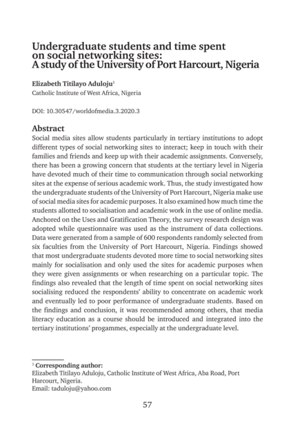 "Social media sites allow students particularly in tertiary institutions to adopt different types of social networking sites to interact; keep in touch with their families and friends and keep up with their academic assignments. Conversely, there has been a growing concern that students at the tertiary level in Nigeria have devoted much of their time to communication through social networking sites at the expense of serious academic work. Thus, the study investigated how the undergraduate students of the University of Port Harcourt, Nigeria make use of social media sites for academic purposes. It also examined how much time the students allotted to socialisation and academic work in the use of online media. Anchored on the Uses and Gratification Theory, the survey research design was adopted while questionnaire was used as the instrument of data collections. Data were generated from a sample of 600 respondents randomly selected from six faculties from the University of Port Harcourt, Nigeria. Findings showed that most undergraduate students devoted more time to social networking sites mainly for socialisation and only used the sites for academic purposes when they were given assignments or when researching on a particular topic. The findings also revealed that the length of time spent on social networking sites socialising reduced the respondents’ ability to concentrate on academic work and eventually led to poor performance of undergraduate students. Based on the findings and conclusion, it was recommended among others, that media literacy education as a course should be introduced and integrated into the tertiary institutions’ progammes, especially at the undergraduate level." (Abstract)