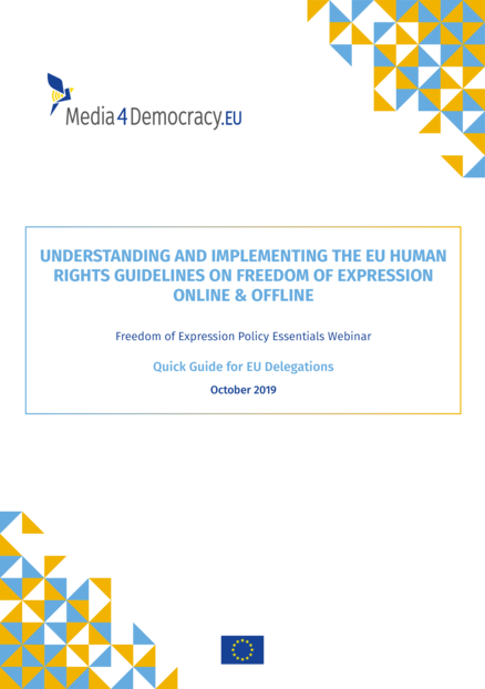 "The EU Human Rights Guidelines on Freedom of Expression Online and Offline (the Guidelines) were approved by the Council of the European Union (EU) in 2014. The Guidelines provide a policy and operational foundation for EU Delegations, EU institutions and Member States working to support freedom of expression and media pluralism. The Guidelines also present good practice approaches to responding in strategic and systematic ways to the challenges of promoting and protecting freedom of expression in diverse contexts [...] This Quick Guide provides a summary of the Guidelines alongside information designed to support EU Delegation staff working in third countries, focusing first on: What EU Delegations Need to Know; then on: What EU Delegations Can Do." (Introduction, page 5)