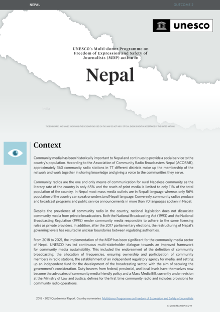 "From 2018 to 2021, the implementation of the MDP has been significant for the community media sector of Nepal. UNESCO has led continuous multi-stakeholder dialogue towards an improved framework for community media sustainability. This included the endorsement of the definition of community broadcasting, the allocation of frequencies, ensuring ownership and participation of community members in radio stations, the establishment of an independent regulatory agency for media, and setting up an independent fund for the development of the broadcasting sector, with the aim of securing the government’s consideration. Duty bearers from federal, provincial, and local levels have themselves now become the advocates of community media friendly policy and a Mass Media Bill, currently under revision at the Ministry of Law and Justice, defines for the first time community radio and includes provisions for community radio operations." (Page 1)
