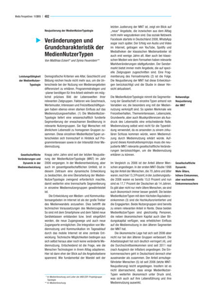 "Die Stärke der MedienNutzerTypologie (MNT) bei der Positionierung und Steuerung von Medienangeboten liegt insbesondere in der Segmentierung von soziodemografisch scheinbar homogenen Gruppen. Spaßorientierte und Zielstrebige gehören zwar der gleichen (jungen) Generation an, unterscheiden sich aber erheblich in ihren Interessenmustern und Wertvorstellungen. In der mittleren Alterskohorte unterteilt die MNT ein ähnlich altes Publikum in drei unterschiedliche Nutzertypen: Moderne Etablierte, Eskapisten und Familienorientierte haben divergierende Lebenswelten und damit auch andere Medien- und Freizeitpräferenzen. Bei den älteren Typen sind es Engagierte und Hochkulturorientierte, die sich von den deutlich traditionelleren Typen unterscheiden. Zwischen den Typen zeigen sich teilweise erhebliche Unterschiede, was die Positionierung der traditionellen Medien und des Internets im Alltag betrifft." (Zusammenfassung)