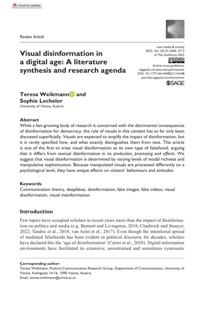 "Visuals are expected to amplify the impact of disinformation, but it is rarely specified how, and what exactly distinguishes them from text. This article is one of the first to treat visual disinformation as its own type of falsehood, arguing that it differs from textual disinformation in its production, processing and effects. We suggest that visual disinformation is determined by varying levels of modal richness and manipulative sophistication. Because manipulated visuals are processed differently on a psychological level, they have unique effects on citizens’ behaviours and attitudes." (Abstract)