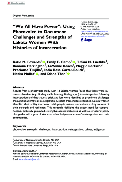 "Results from a photovoice study with 13 Lakota women found that there were numerous barriers (e.g., finding stable housing, finding a job) to reintegration following incarceration and that trauma, grief, and loss were identified as prominent challenges throughout attempts at reintegration. Despite tremendous aversities, Lakota women identified their ability to connect with people, nature, and culture as key sources of their strength and resilience. This research highlights the urgent need for comprehensive, culturally grounded, strengths-focused initiatives as well as structural policy change that will support Lakota and other Indigenous women’s reintegration into their communities." (Abstract)