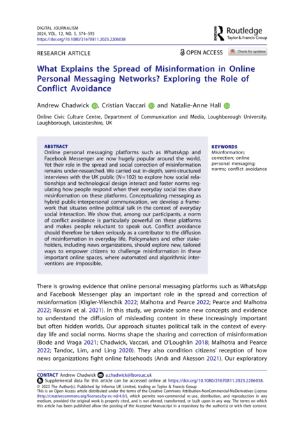 "Online personal messaging platforms such as WhatsApp and Facebook Messenger are now hugely popular around the world. Yet their role in the spread and social correction of misinformation remains under-researched. We carried out in-depth, semi-structured interviews with the UK public (N = 102) to explore how social relationships and technological design interact and foster norms regulating how people respond when their everyday social ties share misinformation on these platforms. Conceptualizing messaging as hybrid public-interpersonal communication, we develop a framework that situates online political talk in the context of everyday social interaction. We show that, among our participants, a norm of conflict avoidance is particularly powerful on these platforms and makes people reluctant to speak out. Conflict avoidance should therefore be taken seriously as a contributor to the diffusion of misinformation in everyday life. Policymakers and other stakeholders, including news organizations, should explore new, tailored ways to empower citizens to challenge misinformation in these important online spaces, where automated and algorithmic interventions are impossible." (Abstract)