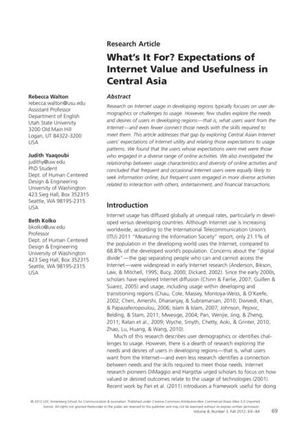 "Research on Internet usage in developing regions typically focuses on user demographics or challenges to usage. However, few studies explore the needs and desires of users in developing regions—that is, what users want from the Internet—and even fewer connect those needs with the skills required to meet them. This article addresses that gap by exploring Central Asian Internet users’ expectations of Internet utility and relating those expectations to usage patterns. We found that the users whose expectations were met were those who engaged in a diverse range of online activities. We also investigated the relationship between usage characteristics and diversity of online activities and concluded that frequent and occasional Internet users were equally likely to seek information online, but frequent users engaged in more diverse activities related to interaction with others, entertainment, and financial transactions." (Abstract)