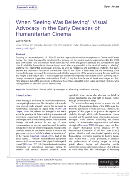 "Focusing on the pivotal period of 1919–23 and the large-scale humanitarian responses in Central and Eastern Europe, this paper discusses the development of advocacy in the movies made by organizations like the ICRC, Save the Children Fund or American Relief Administration. While aid agencies observed and competed with each other for visibility, humanitarian cinema shaped visual advocacy, grounded in the idea that ‘seeing is believing’. Exploring the fragmented audiovisual archives, as well as magazines and promotional material, this paper explores the testimonial function of humanitarian films in the 1920s. It first shows that the immediacy of the cinema technology increased the immersive and affective experience of the viewers by using forensic evidence and images of the body in pain. It then analyses how these films compelled audiences to witness suffering and act through persuasion, suggestion, and emotions. Finally, it inquires into the use of eyewitness images and firsthand accounts during the screenings, to show how these movies operated within larger regimes of visibility, while making claims on behalf of distant beneficiaries." (Abstract)