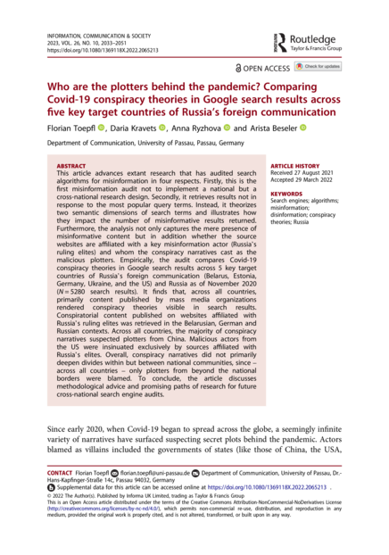 "This article advances extant research that has audited search algorithms for misinformation in four respects. Firstly, this is the first misinformation audit not to implement a national but a cross-national research design. Secondly, it retrieves results not in response to the most popular query terms. Instead, it theorizes two semantic dimensions of search terms and illustrates how they impact the number of misinformative results returned. Furthermore, the analysis not only captures the mere presence of misinformative content but in addition whether the source websites are affiliated with a key misinformation actor (Russia’s ruling elites) and whom the conspiracy narratives cast as the malicious plotters. Empirically, the audit compares Covid-19 conspiracy theories in Google search results across 5 key target countries of Russia’s foreign communication (Belarus, Estonia, Germany, Ukraine, and the US) and Russia as of November 2020 (N = 5280 search results). It finds that, across all countries, primarily content published by mass media organizations rendered conspiracy theories visible in search results. Conspiratorial content published on websites affiliated with Russia’s ruling elites was retrieved in the Belarusian, German and Russian contexts. Across all countries, the majority of conspiracy narratives suspected plotters from China. Malicious actors from the US were insinuated exclusively by sources affiliated with Russia’s elites. Overall, conspiracy narratives did not primarily deepen divides within but between national communities, since – across all countries – only plotters from beyond the national borders were blamed. To conclude, the article discusses methodological advice and promising paths of research for future cross-national search engine audits." (Abstract)