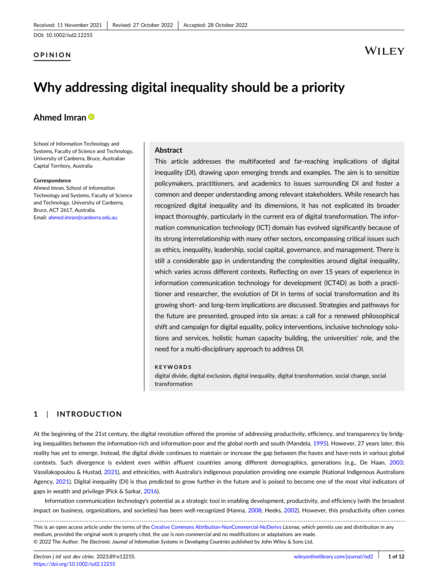 "This article addresses the multifaceted and far-reaching implications of digital inequality (DI), drawing upon emerging trends and examples. The aim is to sensitize policymakers, practitioners, and academics to issues surrounding DI and foster a common and deeper understanding among relevant stakeholders. While research has recognized digital inequality and its dimensions, it has not explicated its broader impact thoroughly, particularly in the current era of digital transformation. The information communication technology (ICT) domain has evolved significantly because of its strong interrelationship with many other sectors, encompassing critical issues such as ethics, inequality, leadership, social capital, governance, and management. There is still a considerable gap in understanding the complexities around digital inequality, which varies across different contexts. Reflecting on over 15 years of experience in information communication technology for development (ICT4D) as both a practitioner and researcher, the evolution of DI in terms of social transformation and its growing short- and long-term implications are discussed. Strategies and pathways for the future are presented, grouped into six areas: a call for a renewed philosophical shift and campaign for digital equality, policy interventions, inclusive technology solutions and services, holistic human capacity building, the universities' role, and the need for a multi-disciplinary approach to address DI." (Abstract)