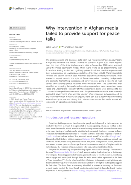 "This article presents and discusses data from two research methods on journalism in Afghanistan before the Taliban takeover of power in August 2021. News reports from the time of the intra-Afghan peace talks in September 2020 were analyzed using the Peace Journalism model. These were found to be predominantly War Journalism, leaving audiences cognitively primed for violent conflict responses and likely to overlook or fail to value peace initiatives. Interviews with 16 Afghan journalists revealed this pattern to be at odds with their aspirations and role perceptions. They wanted to report more in the style of Peace Journalism: revealing backgrounds and contexts; highlighting successes and achievements; giving a voice to all rival parties, and covering peace initiatives from whatever level. The constraints they identified, as impeding their preferred reporting approaches, were categorized using Reese and Shoemaker’s Hierarchy of Influences model. Some were attributed to the commercial competitive market structure of Afghan media under the internationally supported government, after an initial infusion of development aid was reduced. In any such intervention in future, it is argued, news can play a positive role in building a constituency for peace—but only if aid interventions ensure that media are not left to operate on a purely commercial basis." (Abstract)